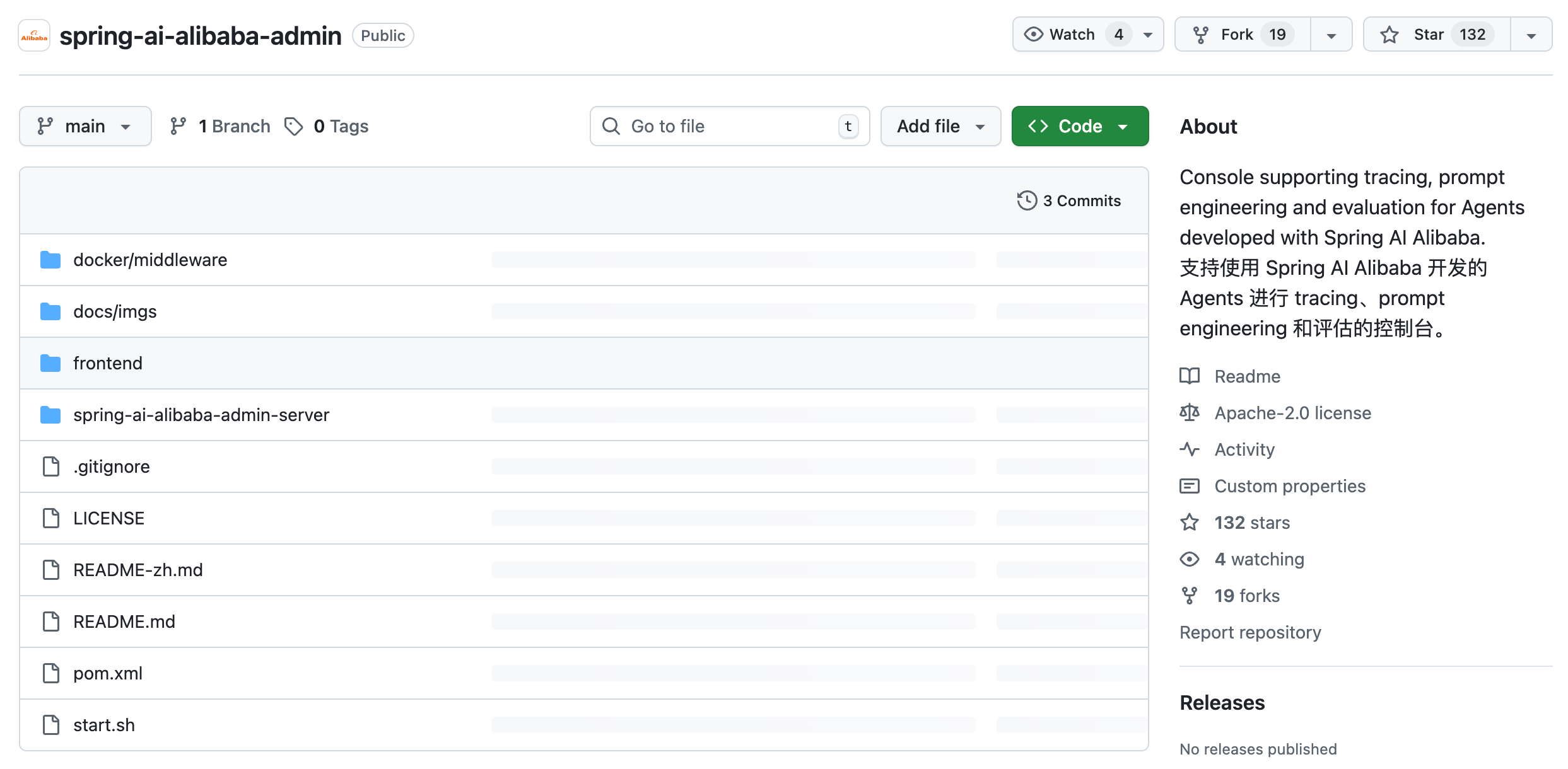 Spring AI Alibaba Admin 项目是基于 Spring AI Alibaba 开发的 Agents 应用的,可以对 AI Agent 应用进行 Tracing、Prompt Engineering 和评估的一个可视化控制台。