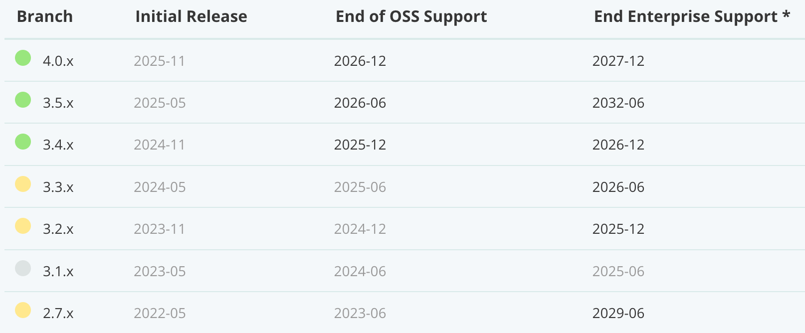 从路线图可以看到每个版本的终止时间,每个版本的生命周期只有一年。