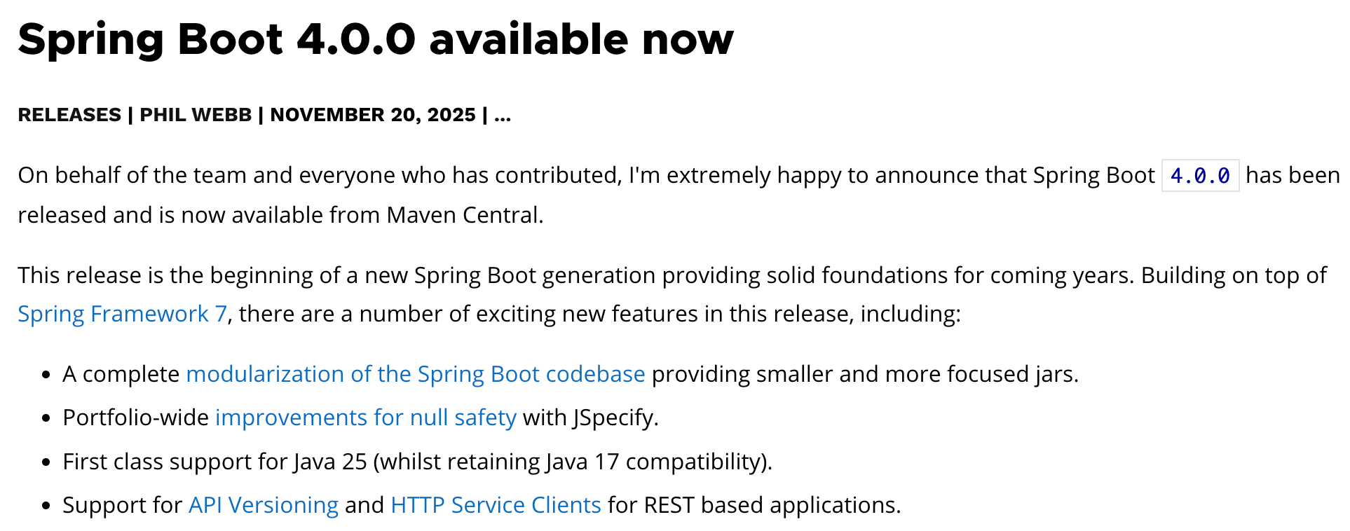 和 Spring Boot 3.0 保持一致,Spring Boot 4.0.0 最低要求也还是 Java 17,但最高支持的版本为 Java 25,Spring 也来到了全新的 Spring 7+。