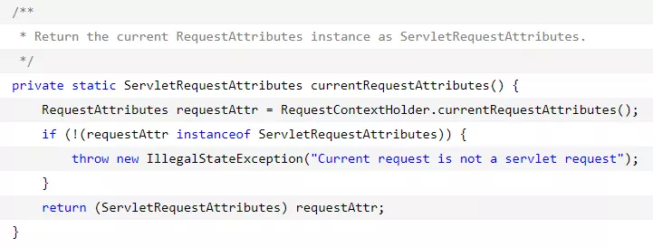 其中,要获得request对象需要先调用currentRequestAttributes()方法获得RequestAttributes对象,该方法的实现如下: