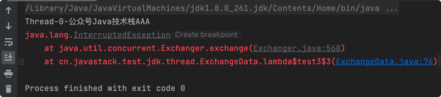 首先线程输出了自己的数据,然后 3 秒后,并没有其他线程和它交换数据,所以抛出了超时异常,最后线程结束运行。